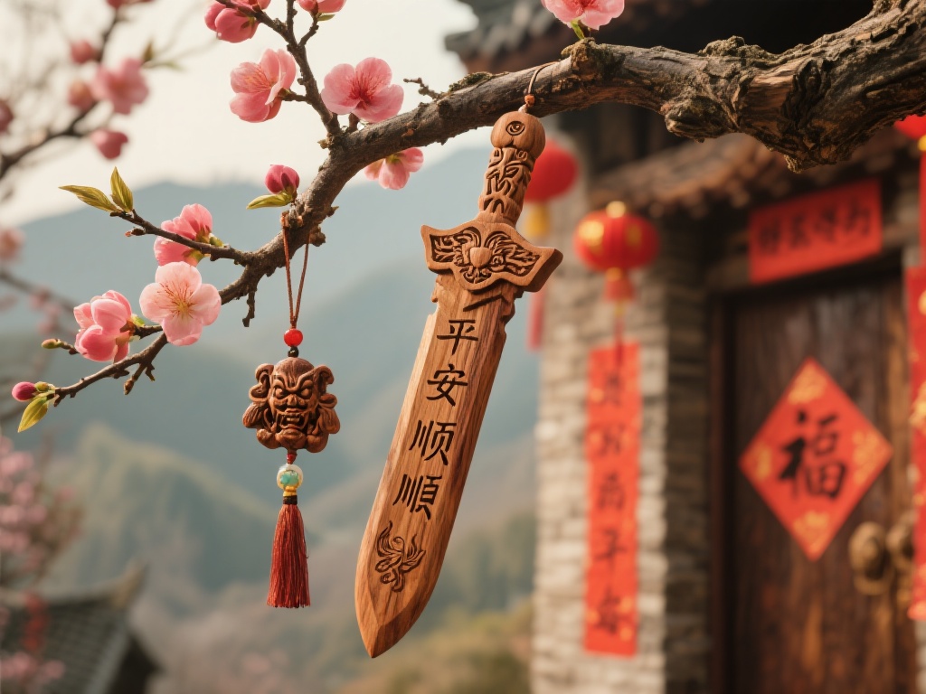 桃木在中国的历史可以追溯到上古时期,相传它具有驱邪避灾的神力。《山海经》中就有关于桃木的记载,认为其能克制恶鬼,保护人间平安。古人常以桃木乃制成剑、符或饰品,用以镇宅或随身携带,寓意平安顺遂。尤其在春节期间,家家户户悬挂桃木枝或贴上桃符,成为一种流传千年的习俗。这种文化根源不仅体现了古人对自然的崇拜,也寄托了人们对美好生活的向往。